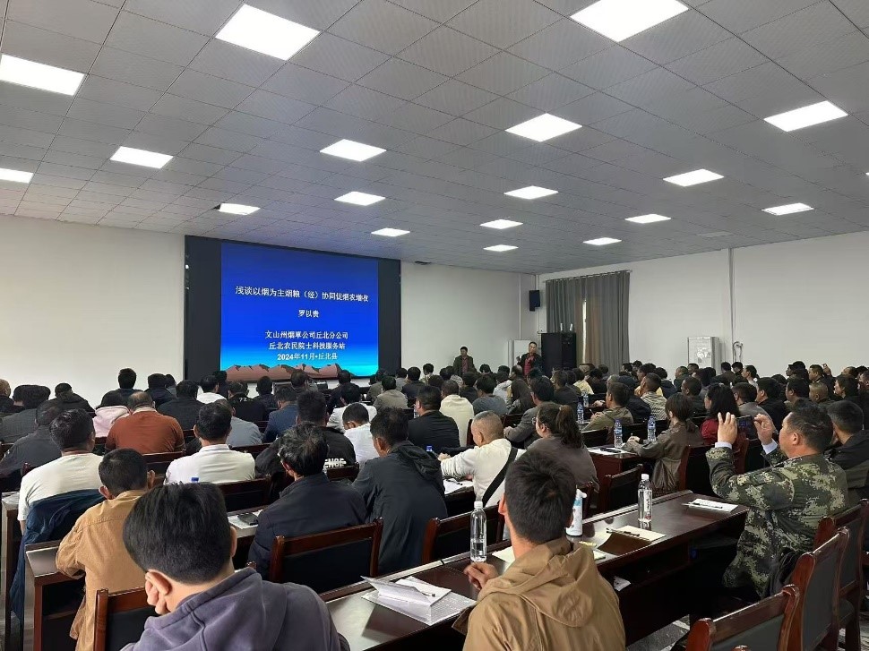 2024年10月21日至23日,丘北农民院士科技服务站联合丘北县人民政府烟草产业办公室和文山州烟草公司丘北县分公司共同举办烟叶生产关键技术和烟粮协同促农增收模式培训会。会议在农民院士科技服务站内举行,培训内容包含烟叶生产关键技术,以烟为主、烟粮协同促农增收模式,烟草病虫害绿色防控和烟叶烘烤原理与烘烤工艺等方面的技术,培训对象为丘北县各乡镇烟农合作社烟草科技员(辅导员),培训共计举办四场次,612人次参加。
